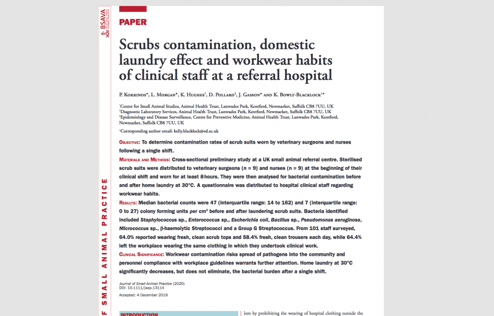 I en undersøgelse beskrevet i JSAP har et hold af dyrlæger og sygeplejersker fået udlveret sterilisret tøj. De skulle bære det en hel arbejdsdag på minimum 8 timer og derefter tage det med hjem og vaske det.
